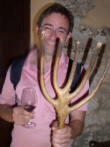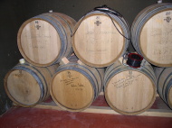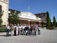 Our visit began in the nursery and research centre, in which all grafting and the research into older Catalan varieties takes place.  Unlike most wineries all young vines are prepared in situ, 2 million plants are grafted in the nursery by up to 40 workers who perform up to 40,000 grafts per day when at full stretch.  3 million Euros a year is spent on r & d, and a small area is set aside for cultivating and analysis of indigenous vines, some sent in by people who have vines planted by forbears in their back yards or vineyards.  A total of 26 varieties are genetically analysed for DNA. One such is Garró, six or so plants of which are being cultivated under plastic sheeting with 100% humidity, allowed to grow as much as possible at the moment solely for their wood and their greenery.  In time a cutting will be taken from each bud, each of which gives a new plant.  One plant gives up to 40,000 buds a year.  Microbiological and chemical analysis is undertaken in the laboratory complex on every product before it leaves the winery, cork quality is routinely monitored for TCA and other faults, the water quality for the winery is also scrutinised, at  harvest time the must-weight levels, alcohol, yeast levels and volatile acidity occurrence are carefully monitored, so as to stop the line should any faults be found, working in 3 shifts round the clock at this time.  Laborious and painstaking classic research into yeast improvement is undergone longterm.  In total one year yields around 140,000 analyses, 500 samples a day are also checked.  The Gerstel Olfactory Detection Port is a device wherein a trained nose notes down the scents and smells coming through, say banana, coffee, leather, recording the exact second the notation was made.  During a thirty minute period of intense concentration a trained sniffer may register a whole page of smells from a single source. Attention is paid to ecological aspects, all solid residual matter and all water is recycled, an artificial lake at Mas la Plana, contains fish, frogs, newts and other creatures. The company currently has 830 employees in Spain, 100 in Chile and 40 in California. 95% of all profits are ploughed back into the firm. Later we visited the 6km-long underground cellar, the museum of wine related artefacts, founded by  Doña Marguerita, mother of Miguel Torres, and were shown the new production halls with a glass wall to asllow visitors to see inside, which are due to open in 2008 as well as tasting the entire range of Torres wines, not only from Catalunya, but also from  Ribera del Duero, California and Chile.  The visit was capped by a gastronomic delight of Catalan specialities prepared by chef Sergi Millet (formerly of El Bulli) in the winery's own stylish Mas Rabell restaurant, each dish accompanied by a chosen wine, finishing with 20-year-old Torres brandy, orange liqueur and their own olive oil from the Arbequinas variety (during the course of the second visit with the group we were repeatedly offered 30-year-old Don Jaime I brandy - their purchases were taking a very long time and good sport Luís, the export manager, kept on bringing more bottles...  you can see the effect on the photo of one happy participant!). Freixenet a Segura Viudas