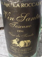 "La Roccaia" Vin Santo Toscano 1994 - Az. Agr. La Roccaia, San Gimignano, Toskánsko, Itálie: Vin Santo je tzv. "svaté" víno z Toskánska. Vyrábí se tradičním oxidačním způsobem kdy se hrozny z odrůd Trebbiano a Malvasia nechávají přes zimu vyschnout v dobře větraných půdních prostorách. Výsledný vylisovaný mošt se zapečetí do 50litrových soudků, na jejichž dnech jsou kvasničné kaly z předešlých šarží. Víno kvasí pomalu, následně zraje bez dolévání a celý proces trvá zpravidla tři, ale často až pět i šest let. Tento exemplář je zlatavého roucha, intenzivního medového aroma s vyváženou chutí a velmi dlouhým dozníváním. Podává se s cukrovím Cantuccini, které se ve víně namáčí.